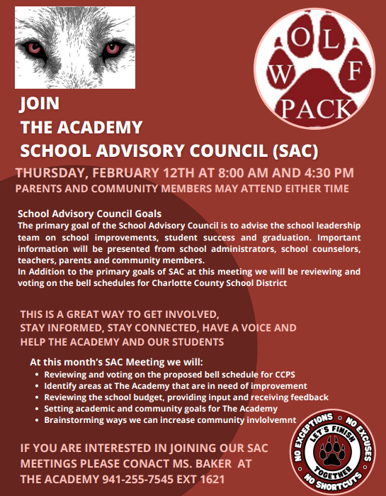 Join The Academy School Advisory Council (SAC) Thursday, Feb. 12th at 8:00 am or 4:30 pm. SAC is a great way to get involved and stay informed! At our February SAC meeting we will be voting on th...